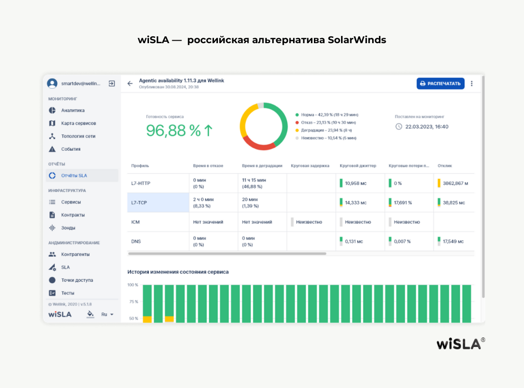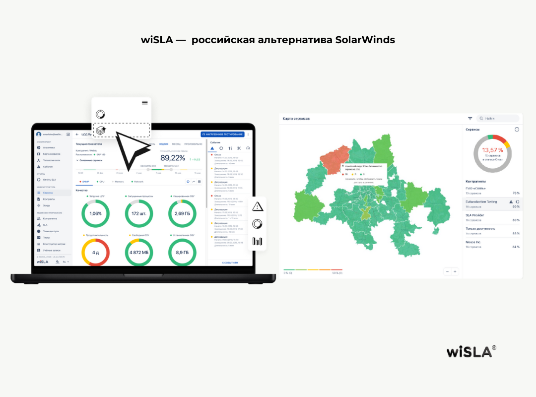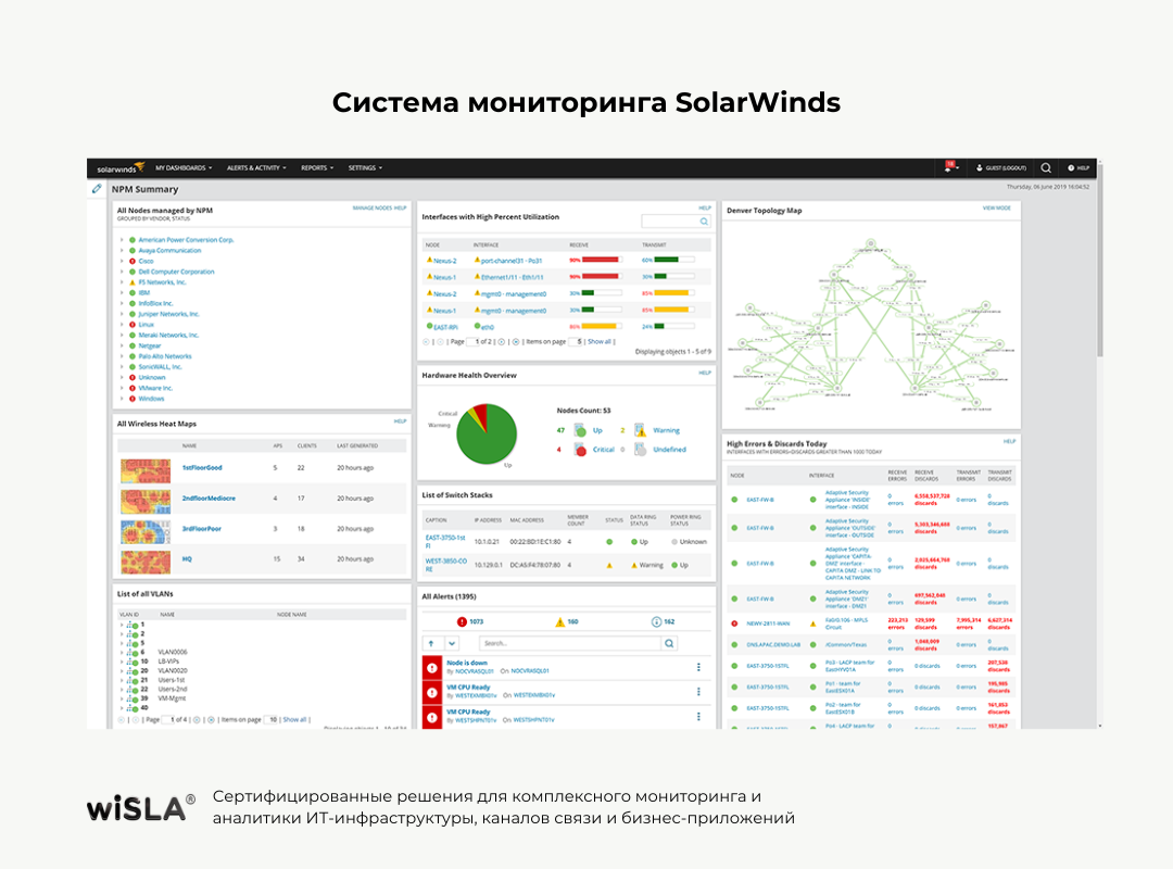 wiSLA включает весь необходимый функционал, представленный в SolarWinds, и дополняет его возможностями: мониторинг каналов связи, нагрузочное тестирование, визуализация в формате дашбордов, топологий, карт сети, контроль SLA и генерация отчетности, сценарный и синтетический мониторинг, гибкая система оповещений, включая интеграции с мессенджерами