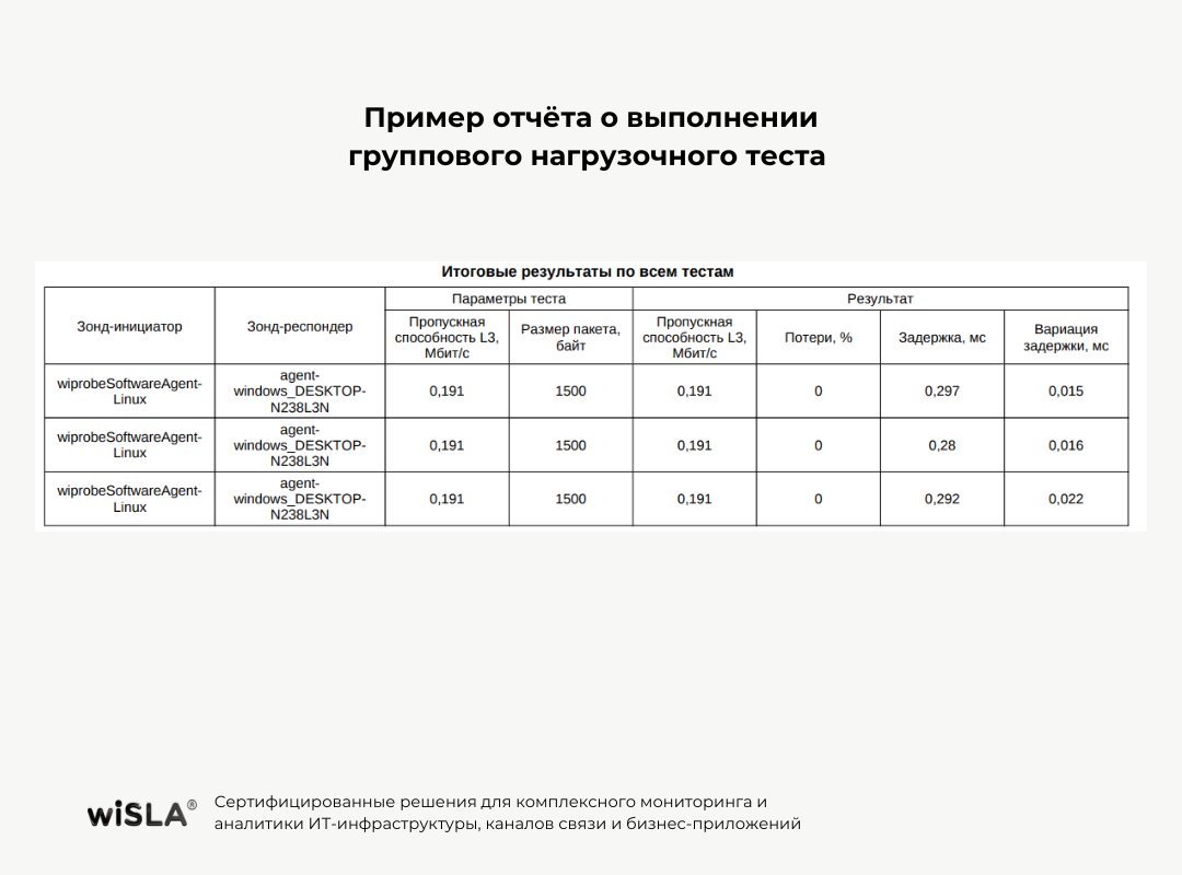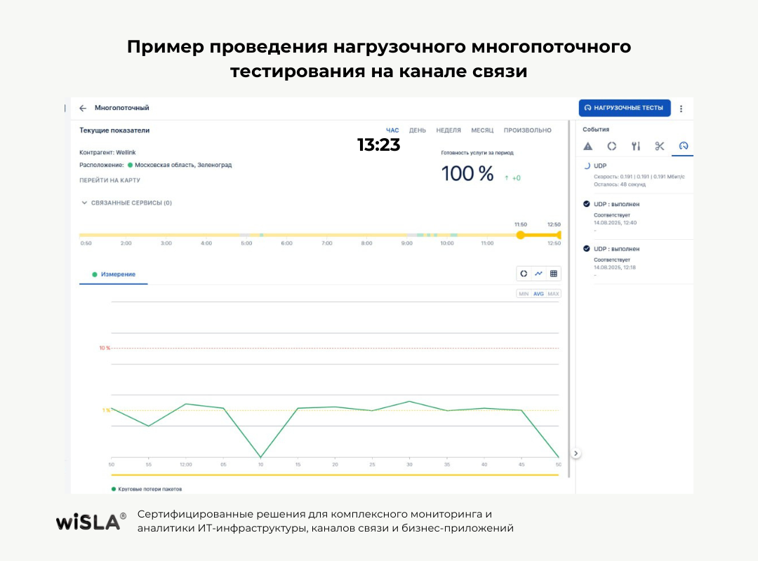 Интервальный нагрузочный тест — это запатентованная технология платформы wiSLA, предназначенная для проверки соответствия реальных характеристик канала связи к заявленным. Этот инструмент создает длительную нагрузку на канал и в течение всей сессии каждые 10 секунд фиксирует критически важные параметры: кратковременные снижения пропускной способности, стабильность соединения, отслеживание резких скачков нагрузки на сеть, потери пакетов.